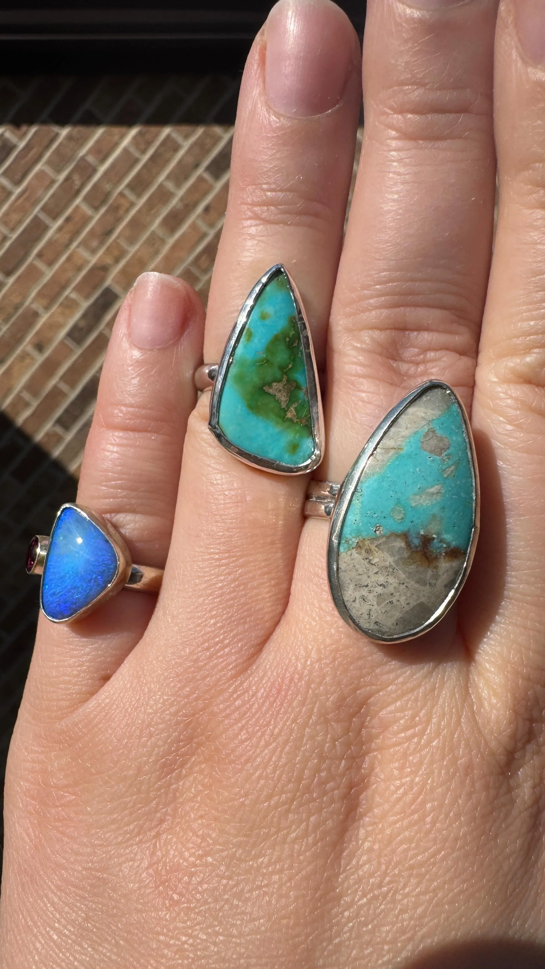 These are so much fun to wear! Comfy but with a bit of heft, these shimmery, entirely handmade statement earrings, crafted out of solid sterling silver with hook ear wires, are sure to catch everyone's eye. And they have a slight jingle and are so satisfying on the ear! Cool, pale blue Golden Hills turquoise cabochons with gorgeous coloring and matrices accent the fun circle and tear drop-shaped dangles. One of a kind, and one of the coolest earrings in my shop!